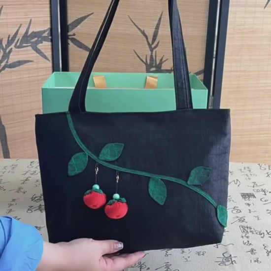 Oriental Gambiered Silk Crossbody Bag with Red Persimmon Charm - Unique Artistic Shoulder Purse