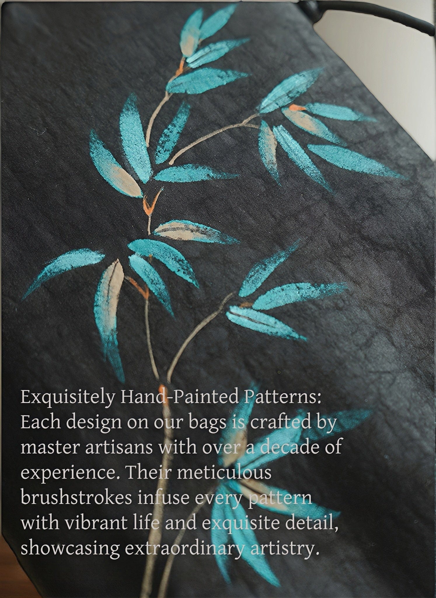 Every pattern on our bags is a masterpiece hand-painted by master artisans with over a decade of expertise.Renowned as 'soft gold', Gambiered Canton Gauze is a natural, plant-dyed silk known for its durability, unique texture, and cool touch