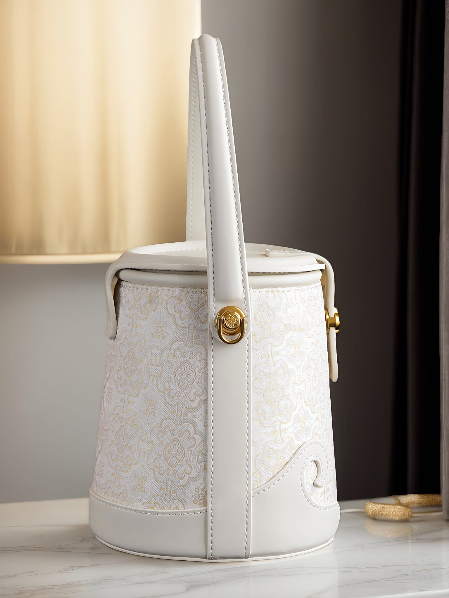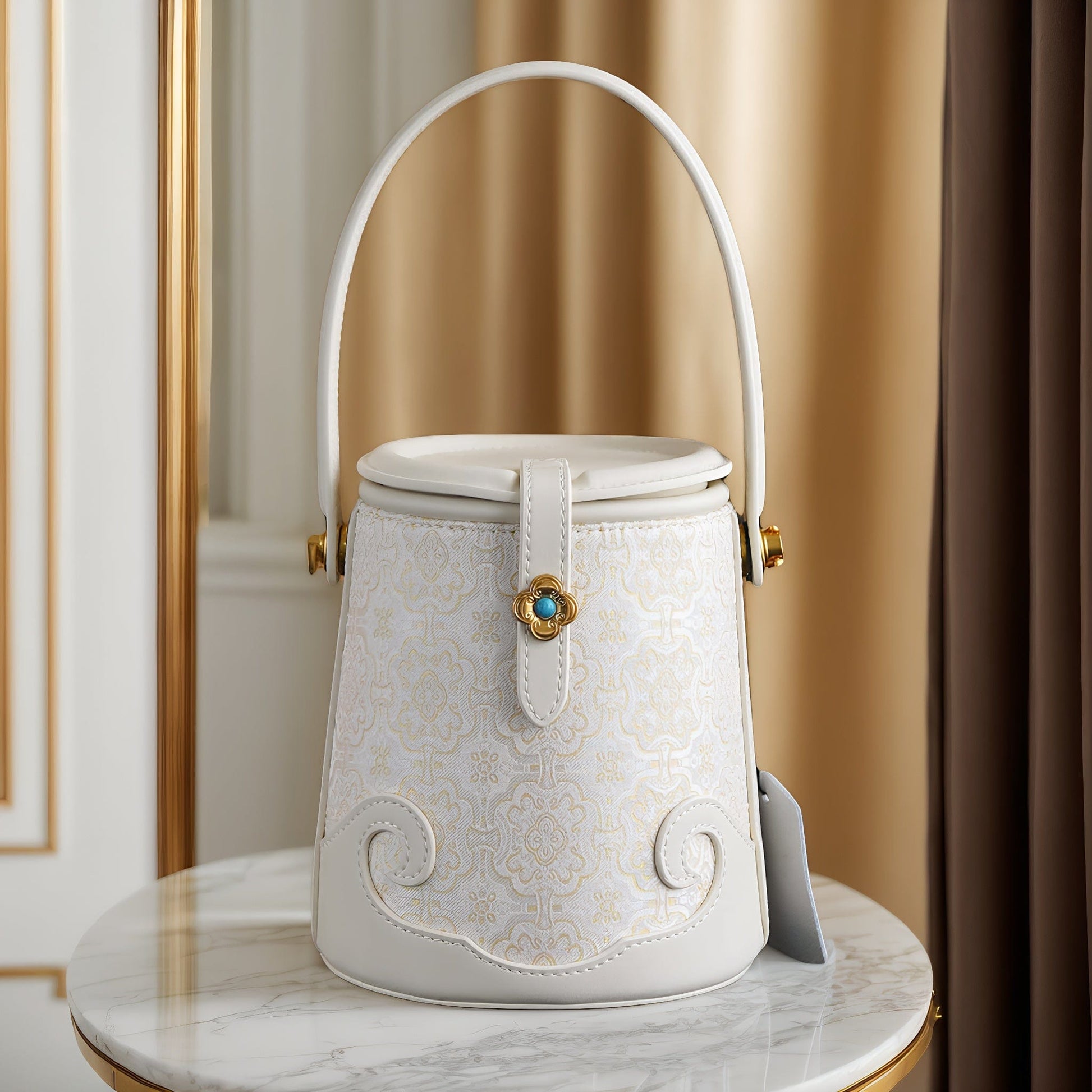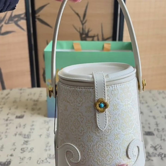 Luxury White Bucket Bag - Exquisite Silk Song Brocade with Traditional Motif, East-Meets-West Versatile Shoulder Bag