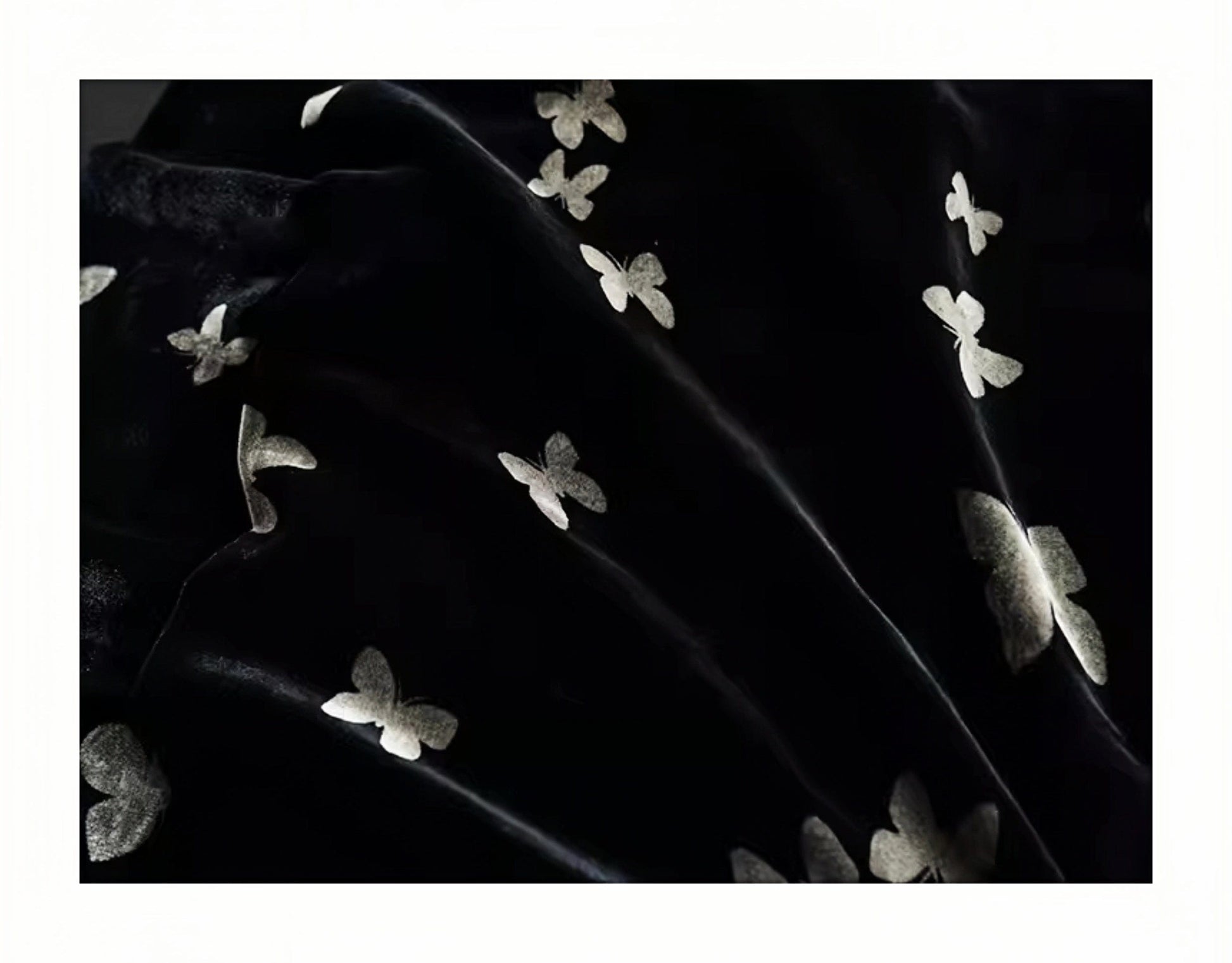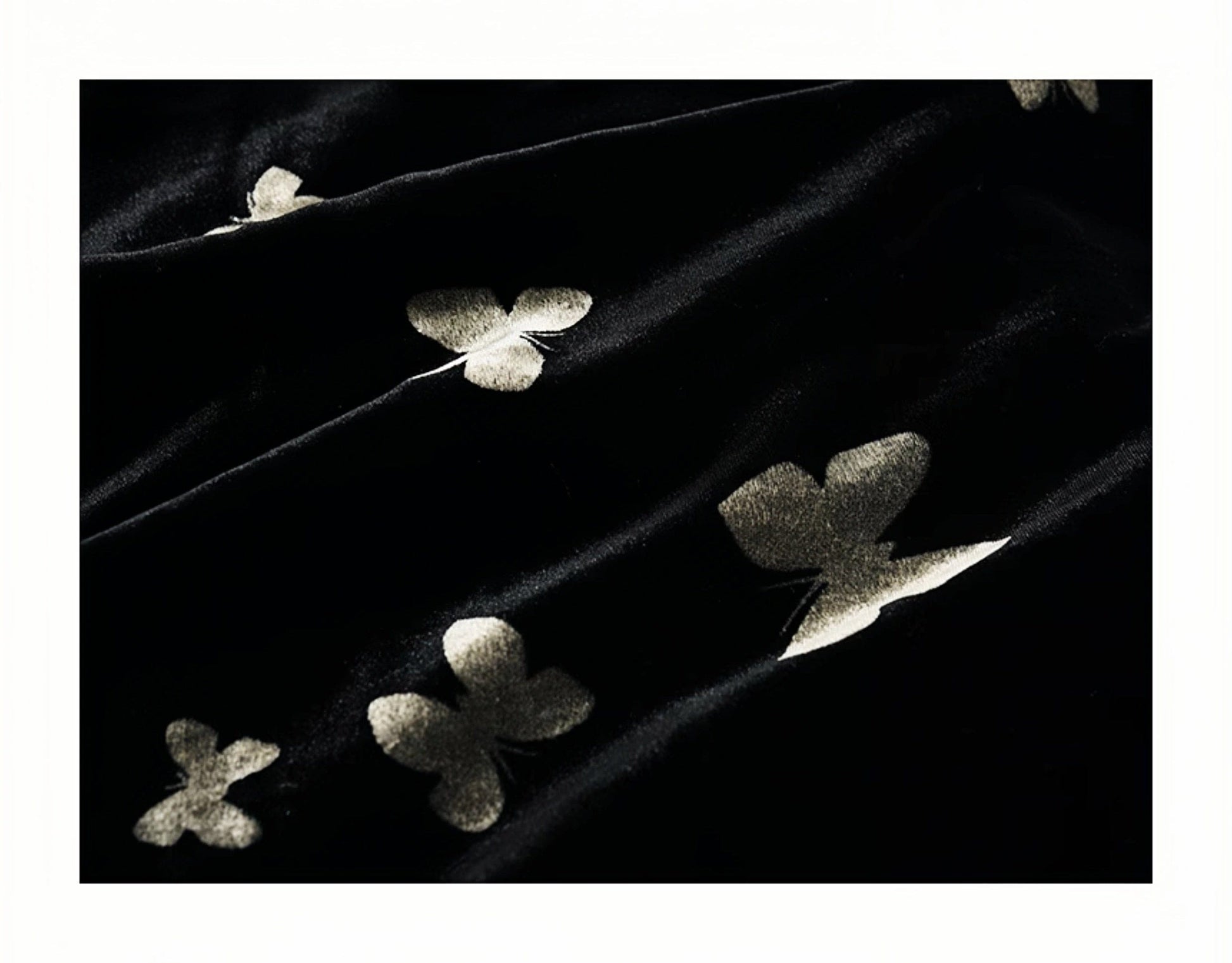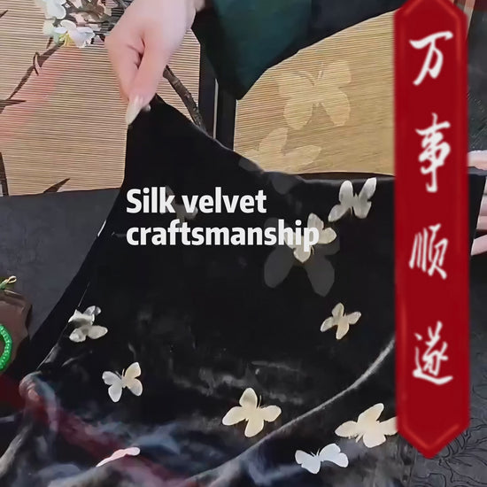 Silk velvet craftsmanship. Its lustre flows imperceptibly, and the inlaid butterfly motif further enhances the texture.
