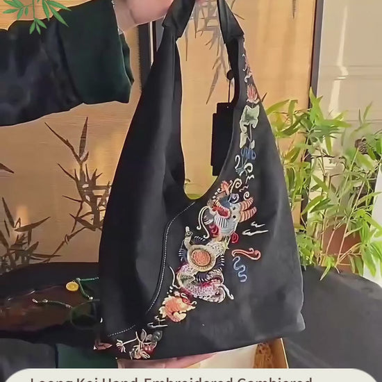 Discover the Loong Li Xiangyunsha Tote, where ancient legend meets modern elegance. Each stitch on this hand-embroidered bag vividly brings to life the captivating Chinese tale of 鲤(Li)鱼(Yu)跳(Tiao)龙(Loong)门(Men)(A Carp Leaping Over the Loong Gate) – a timeless story symbolizing great success, perseverance, and an uplifting spirit.